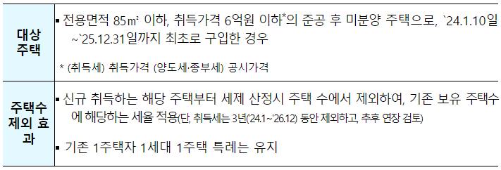 | 지방 준공후 미분양 구입시 주택수 제외 | 지방세법 시행령 개정 | '24.5 |