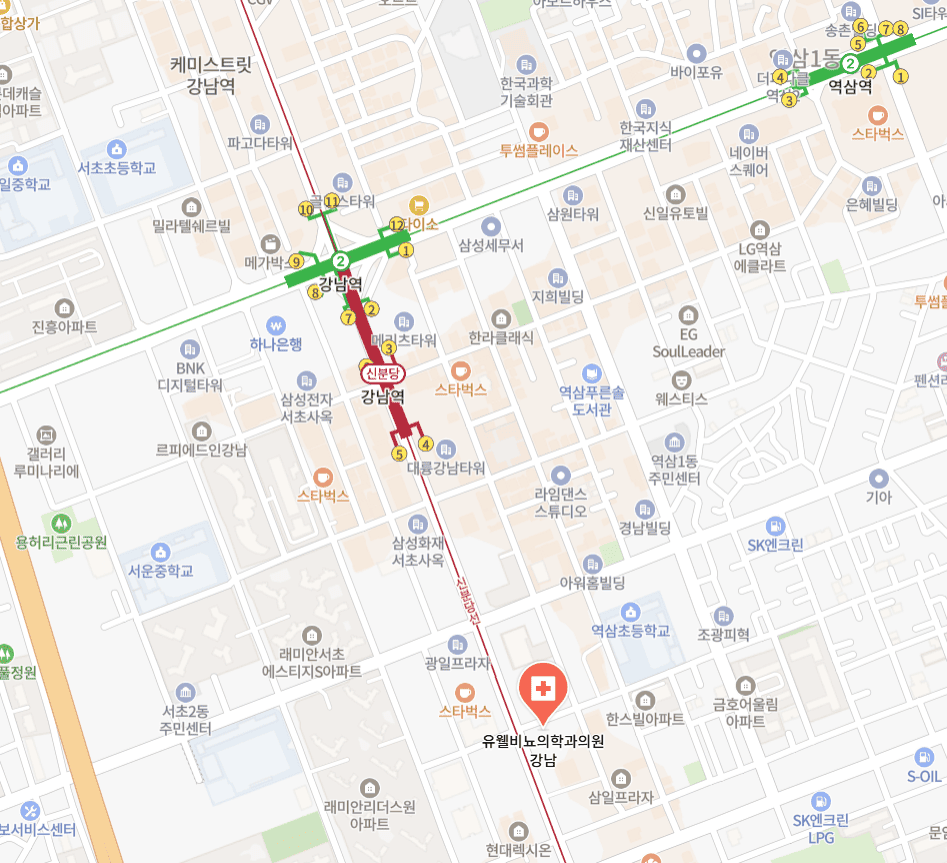 유웰비뇨의학과 강남점는 서울 특별시 강남구 강남대로 406 6층 601호에 위치합니다. 지하철 강남역·양재역 사이에서 위치해 있고 도보 약 6~10분 거리로 대중교통으로 접근이 매우 용이합니다. 오시는 길은 신분당선 강남역 4번 출구로 나와 강남대로를 따라 직진한 뒤 건물 6층으로 올라가면 해당 의원이 자리하고 있어 처음 방문하시는 분도 쉽게 찾을 수 있습니다.